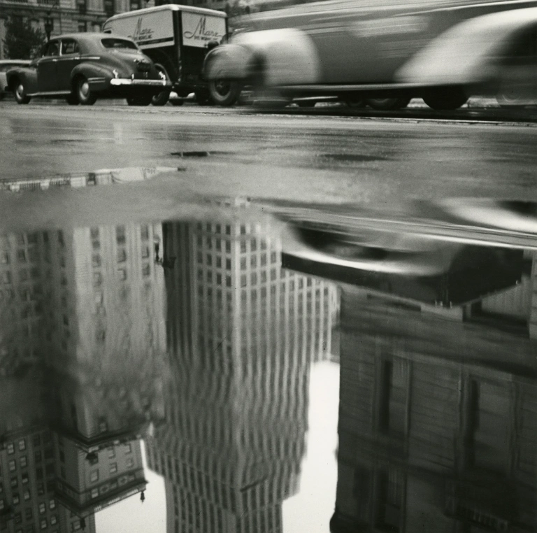 This black and white photograph above by Frank depicts a road scape. It appears to be taken very low to the ground, encompassing the reflection of the city’s buildings within the puddle of water. This portion of the photograph has taken up the majority of the image; some of the buildings are in sharper focus than others due to movement.
